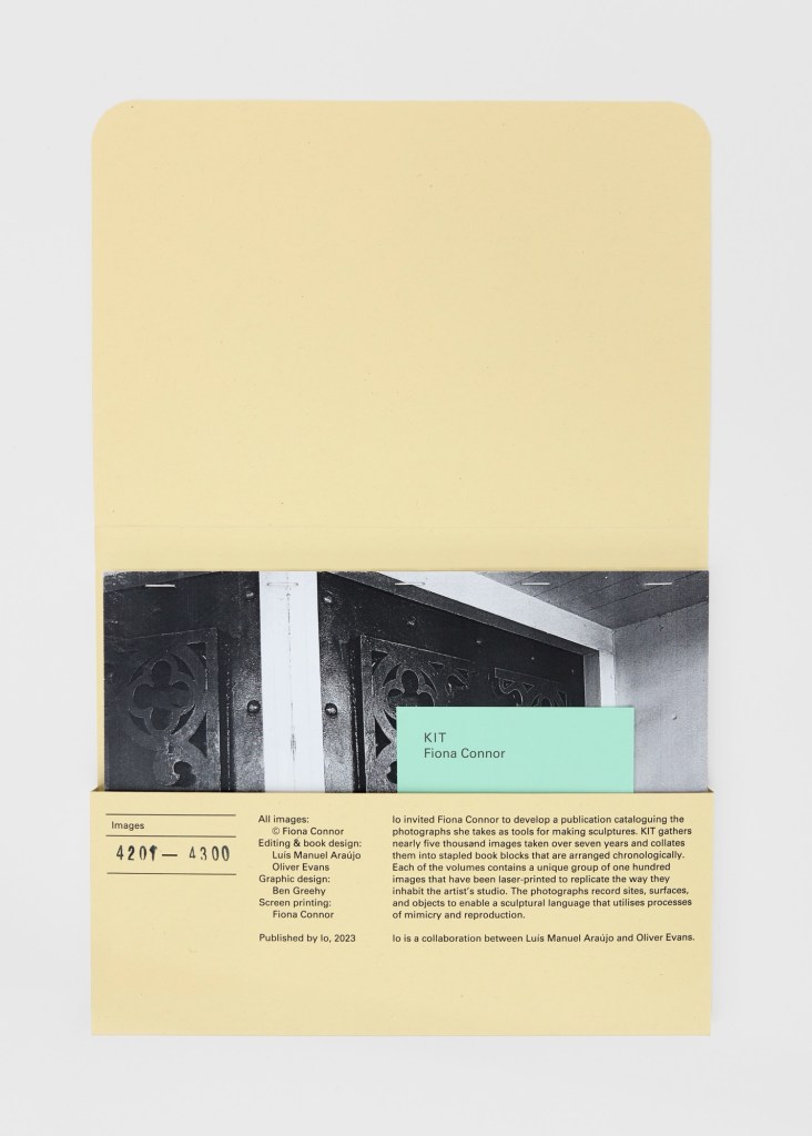 KIT is a series of forty-nine unique artist books, each comprising a different group of one hundred photographs on sheets of recycled paper, bound by five heavy-duty staples. The images are laser-printed single-sided in black and white to replicate how they inhabit the artist’s studio. The book blocks are housed in custom-made manilla folders, with graphic design by Ben Greehy and screen printed by Fiona Connor. An insert card accompanies this project, providing an index of the different cover pages.